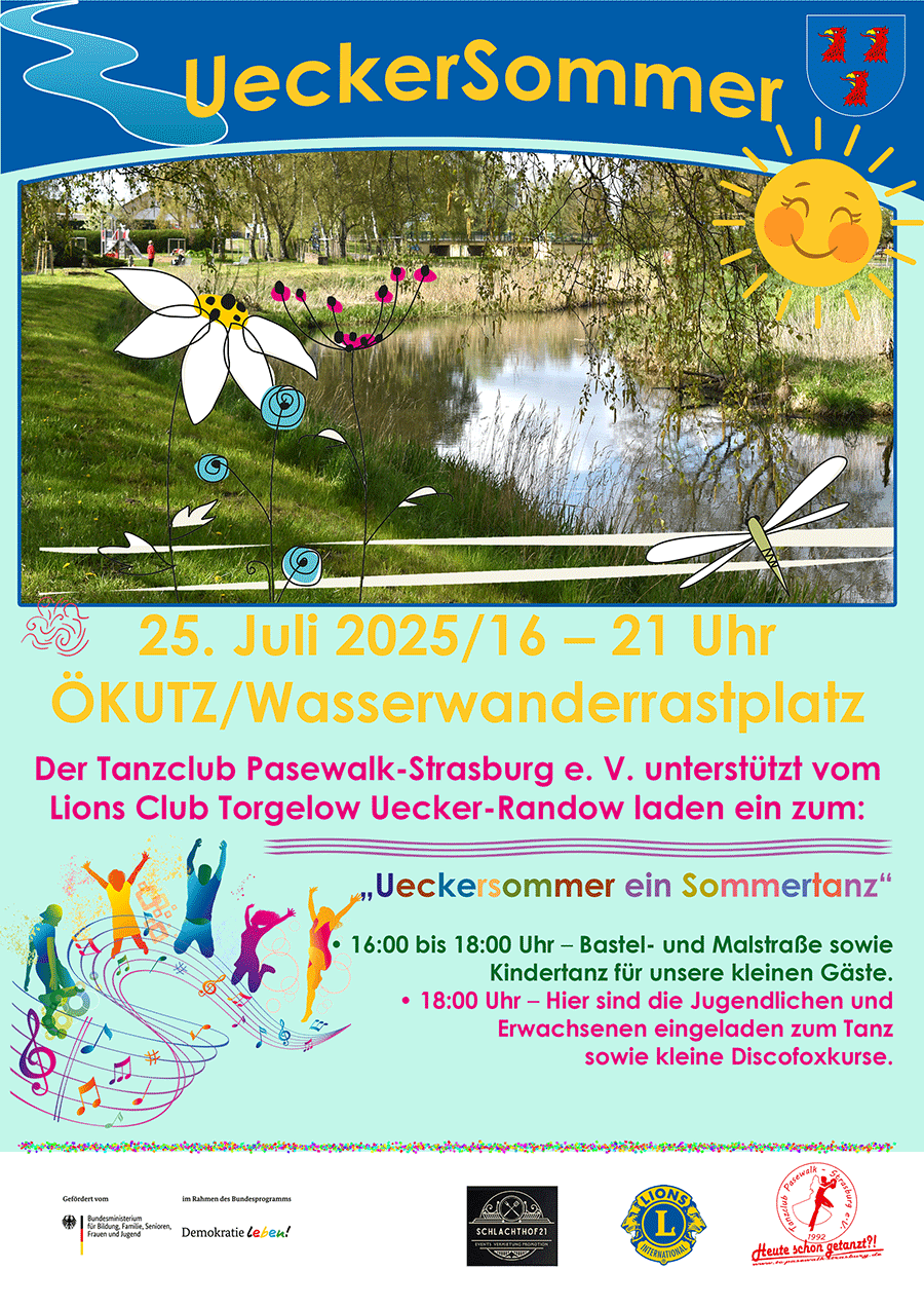 Am 25.07. 2025 richtete der Tanzclub Pasewalk Strasburg mit Unterstützung des Lions Club Torgelow Uecker Randow einen Uecker-Sommer aus. Es war eine sehr schöne Veranstaltung bei der unser Verein alle Aktivitäten rund ums Tanzen organisierte und der Lions Club für Speisen und Getränke sorgte. Die Einnahmen bekamen wir als Spende und obendrauf spendete der Lions Club noch eine Jahresmitgliedschaft für einen Jungen, der sich auf dem Uecker-Sommer entschieden hat, in unserem Verein zu tanzen. Danke dafür!